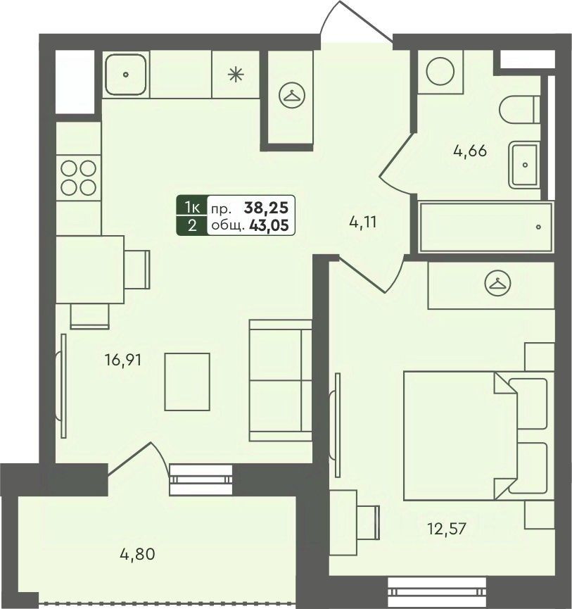 Площадь общая43 м²