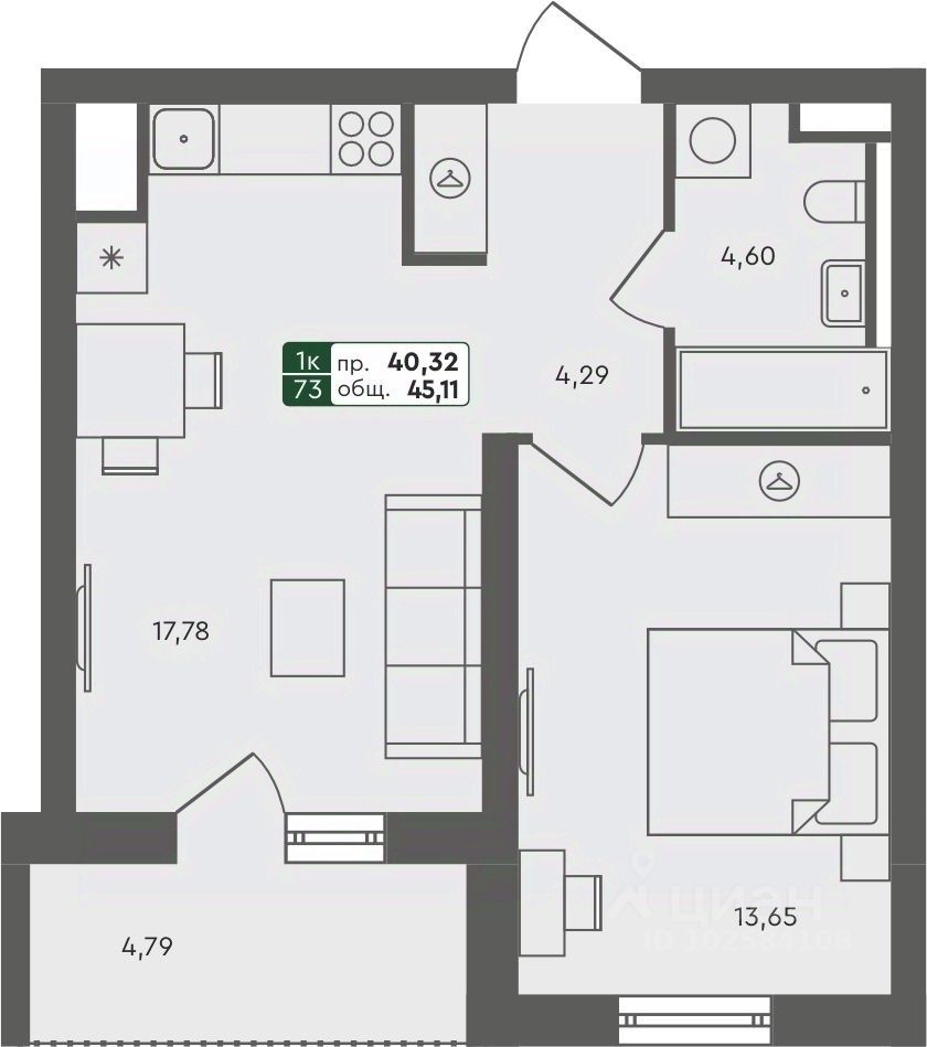 Продаётся 1-комнатная квартира в строящемся доме (ГП 2.1), срок сдачи: III-кв. 2026, общей площадью 45.11 кв.м., на 5 этаже.