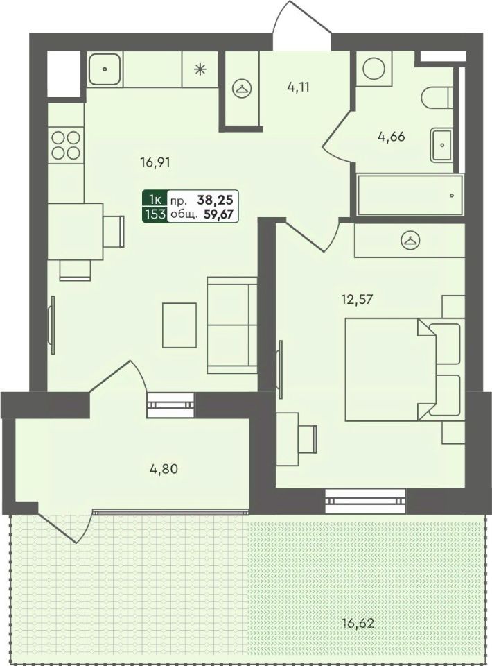 1-комнатная квартира, 59.7 м²