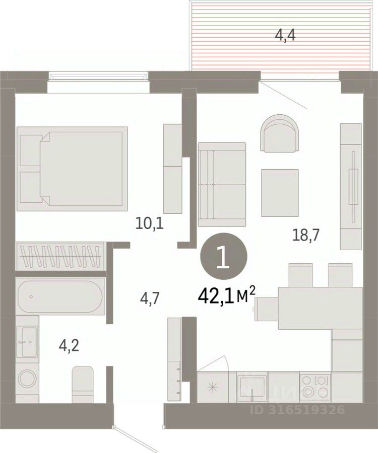 Продается 1-комн. квартира с первичной отделкой в Кварталы Драверта на 3 этаже. Общая площадь: 42.11 кв.м. Высота потолков 2.7 м.