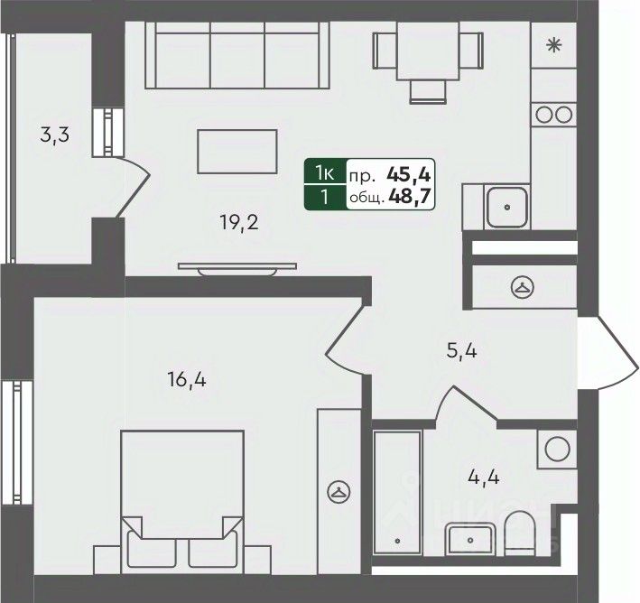 Продаётся 1-комнатная квартира в строящемся доме (ГП 1.1), срок сдачи: IV-кв. 2025, общей площадью 48.7 кв.м., на 4 этаже.
