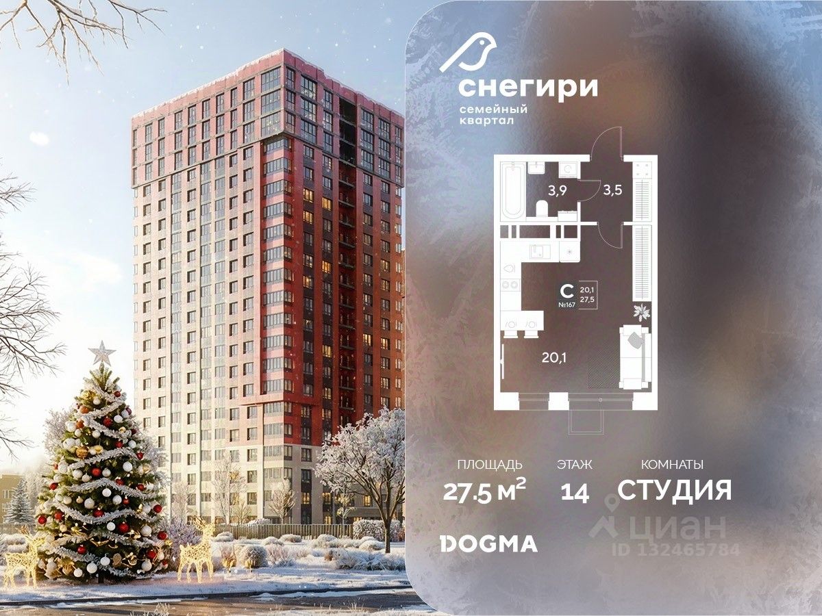 В продаже Студия от застройщика DOGMA! ЖК ''Снегири'', г. Омск, Литер 1 Срок сдачи: (4 кв. 2027, общей площадью 27.5 кв.м., на 14 этаже.) Район для счастливой жизни