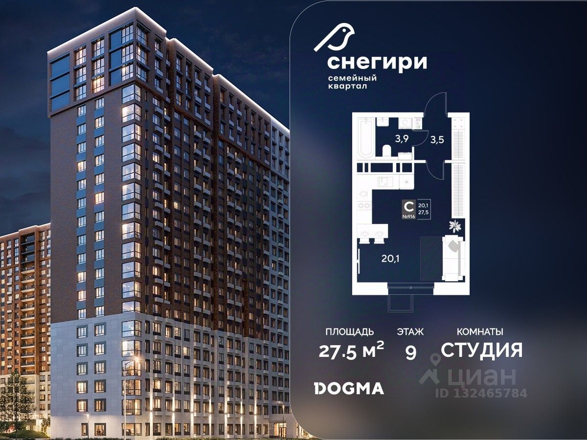Срок сдачи: 4 кв. 2027, общей площадью 27.5 кв.м., на 9 этаже.