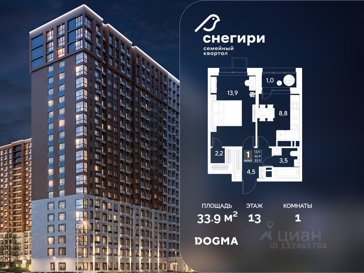 Срок сдачи: 4 кв. 2027, общей площадью 33.9 кв.м., на 13 этаже.