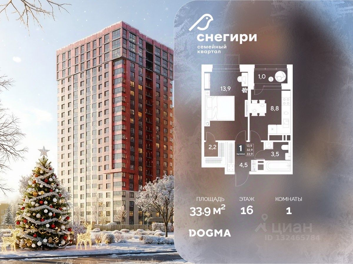 В продаже 1-комнатная квартира от застройщика DOGMA! ЖК ''Снегири'', г. Омск, Литер 1 Срок сдачи: (4 кв. 2027, общей площадью 33.9 кв.м., на 16 этаже.) Район для счастливой жизни