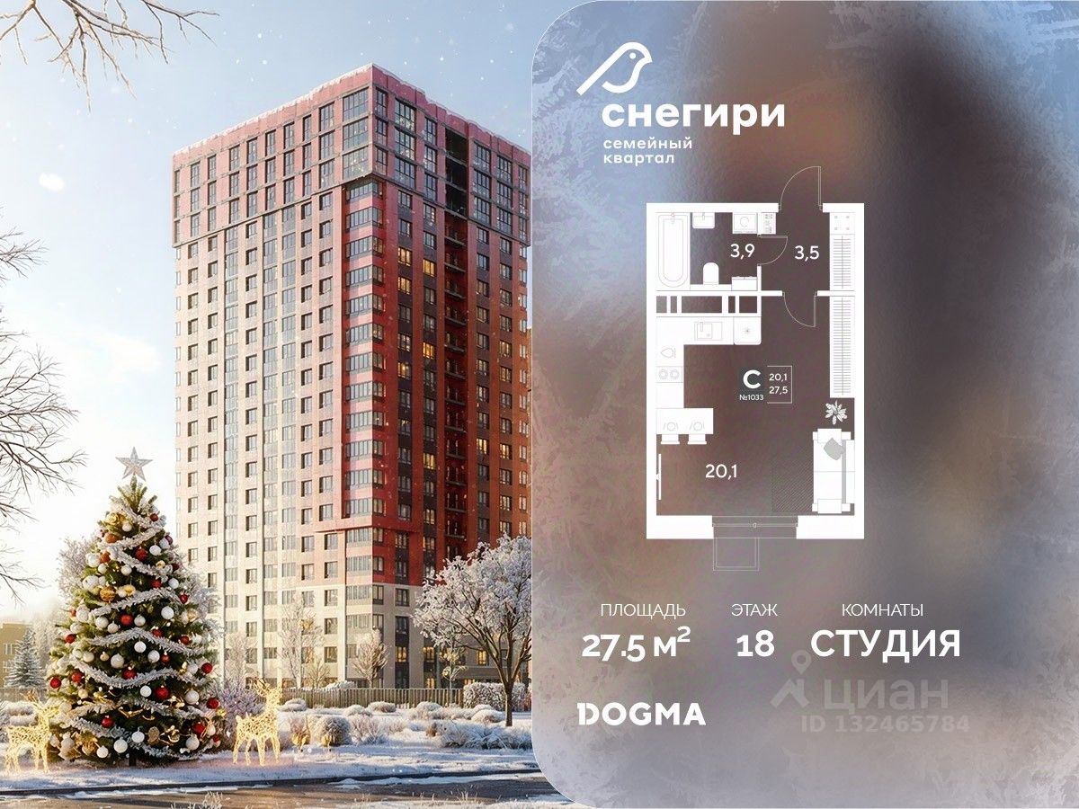 В продаже Студия от застройщика DOGMA! ЖК ''Снегири'', г. Омск, Литер 1 Срок сдачи: (4 кв. 2027, общей площадью 27.5 кв.м., на 18 этаже.) Район для счастливой жизни
