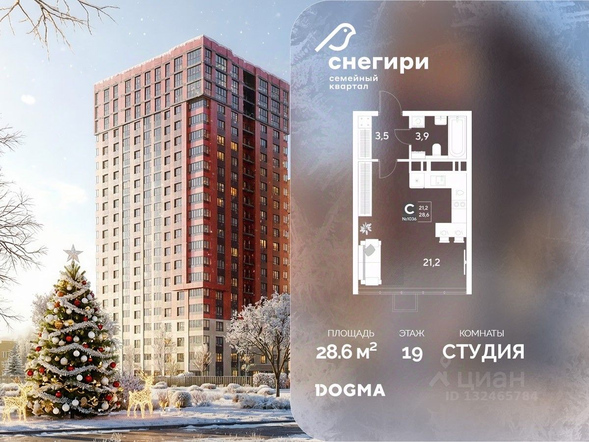 В продаже Студия от застройщика DOGMA! ЖК ''Снегири'', г. Омск, Литер 1 Срок сдачи: (4 кв. 2027, общей площадью 28.6 кв.м., на 19 этаже.) Район для счастливой жизни