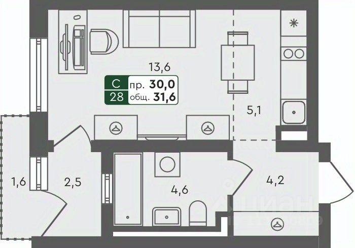 Продаётся студия в строящемся доме (ГП 1.1), срок сдачи: IV-кв. 2025, общей площадью 31.6 кв.м., на 1 этаже.