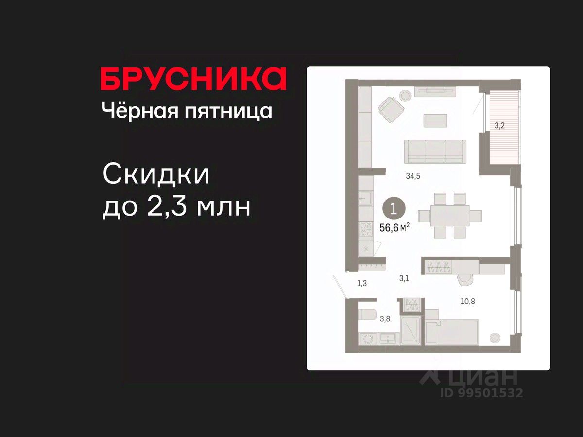 1-комн. квартира от застройщика с предчистовой отделкой в Кварталы Драверта на 3 этаже. Общая площадь: 56.66 кв.м., жилая: 10.8 кв.м., площадь просторной кухни-гостиной: 34.5 кв.м. Все окна выходят на одну сторону. В квартире одна лоджия, один совмещенный санузел. Высота потолков 2.82 м.