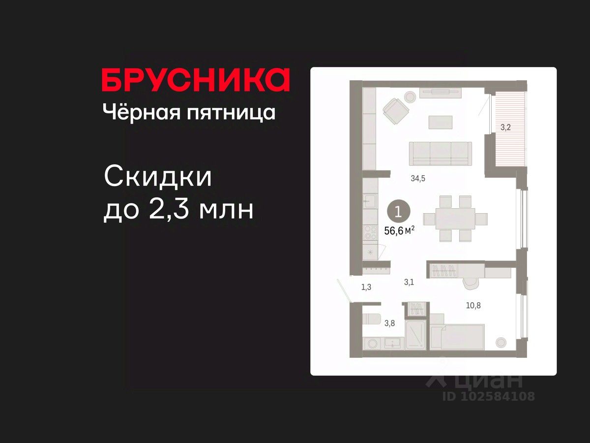 1-комн. квартира от застройщика с предчистовой отделкой в Кварталы Драверта на 3 этаже. Общая площадь: 56.66 кв.м., жилая: 10.8 кв.м., площадь просторной кухни-гостиной: 34.5 кв.м. Все окна выходят на одну сторону. В квартире одна лоджия, один совмещенный санузел. Высота потолков 2.82 м.