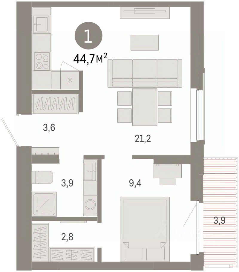 Продается 1-комн. квартира с предчистовой отделкой в Кварталы Драверта на 3 этаже. Общая площадь: 44.75 кв.м., жилая: 9.4 кв.м., площадь просторной кухни-гостиной: 21.2 кв.м. Все окна выходят на одну сторону. В квартире один балкон, один совмещенный санузел. Высота потолков 2.82 м.