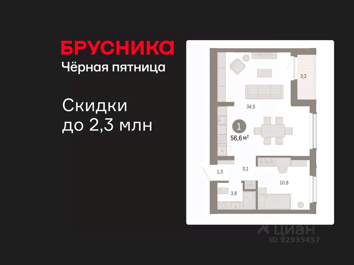 Квартира с кухней-гостиной и одной спальней в Кварталах Драверта. Особенности планировки: тёплая лоджия, разнесённые спальни, предчистовая отделка.