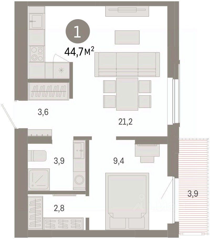 1-комнатная квартира, 44.7 м²