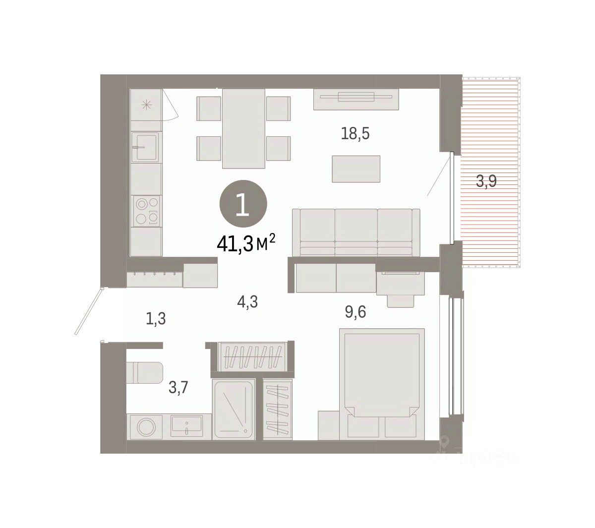 Квартира с кухней-гостиной и одной спальней в Кварталах Драверта. Особенности планировки: новые лоты, предчистовая отделка, балкон.