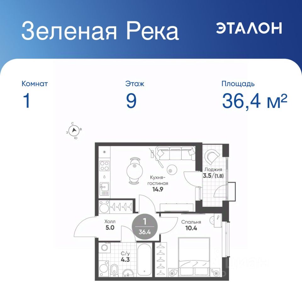 Общая площадь квартиры — 36.4 кв. м, этаж 9 из 11.