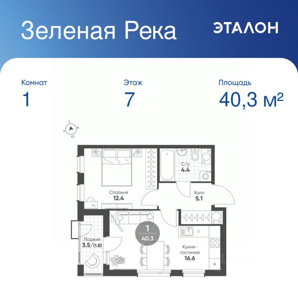 Общая площадь квартиры — 40.3 кв. м, этаж 7 из 11.
