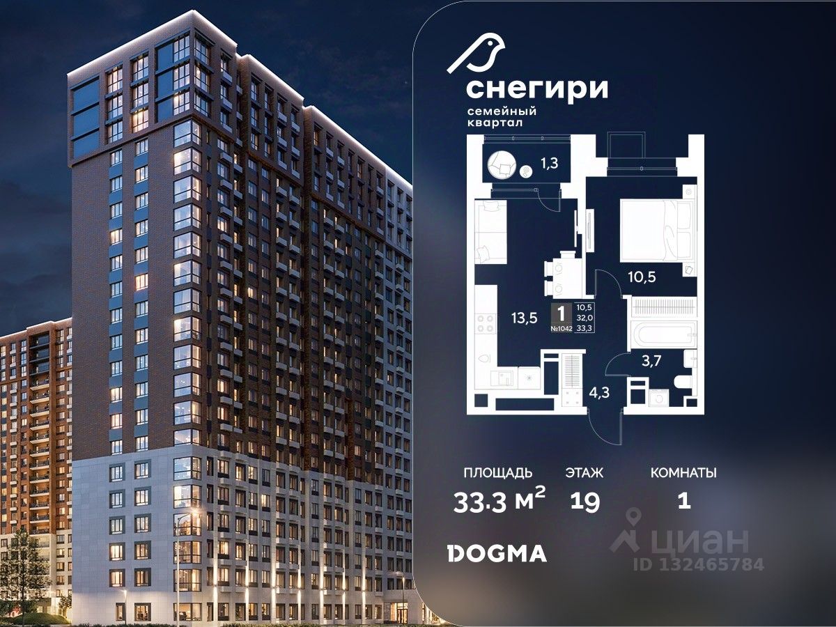 В продаже 1-комнатная квартира от застройщика DOGMA! ЖК ''Снегири'', г. Омск, Литер 1 Срок сдачи: (4 кв. 2027, общей площадью 33.3 кв.м., на 19 этаже.) Район для счастливой жизни