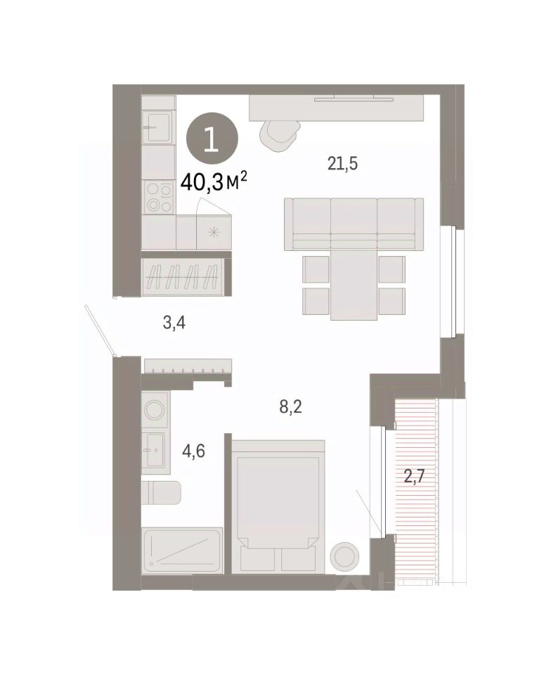 1-комнатная квартира, 40.3 м²