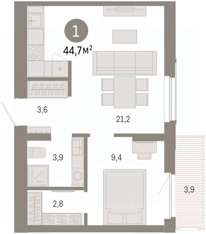 1-комн. квартира с предчистовой отделкой в Кварталы Драверта на 7 этаже. Общая площадь: 44.75 кв.м., жилая: 9.4 кв.м., площадь просторной кухни-гостиной: 21.2 кв.м. Все окна выходят на одну сторону. В квартире один балкон, один совмещенный санузел. Высота потолков 2.82 м.