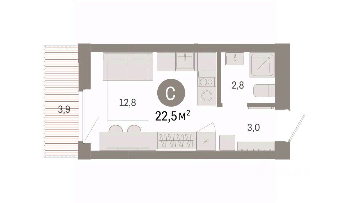 Однокомнатная студия от застройщика с предчистовой отделкой в Кварталы Драверта на 7 этаже. Общая площадь: 22.52 кв.м. Высота потолков 2.82 м.