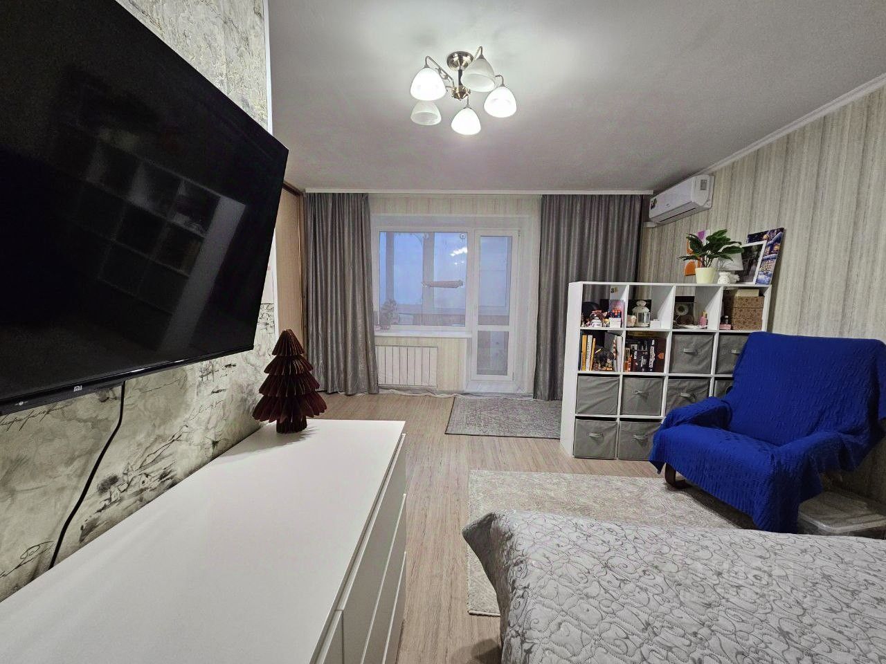 Квартира в аккуратном состоянии — можно заехать и жить без срочных вложений. Уютная комната с кондиционером, много мест хранения (встроенный шкаф).