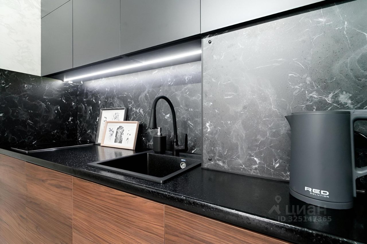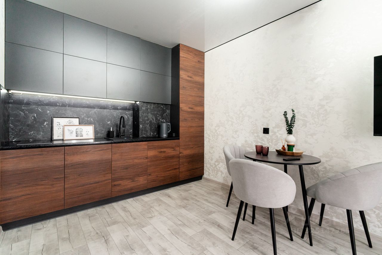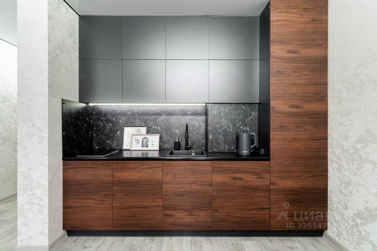 -выделенная зона кухни с кухонным гарнитуром, который соответствует последним модным тенденциям.