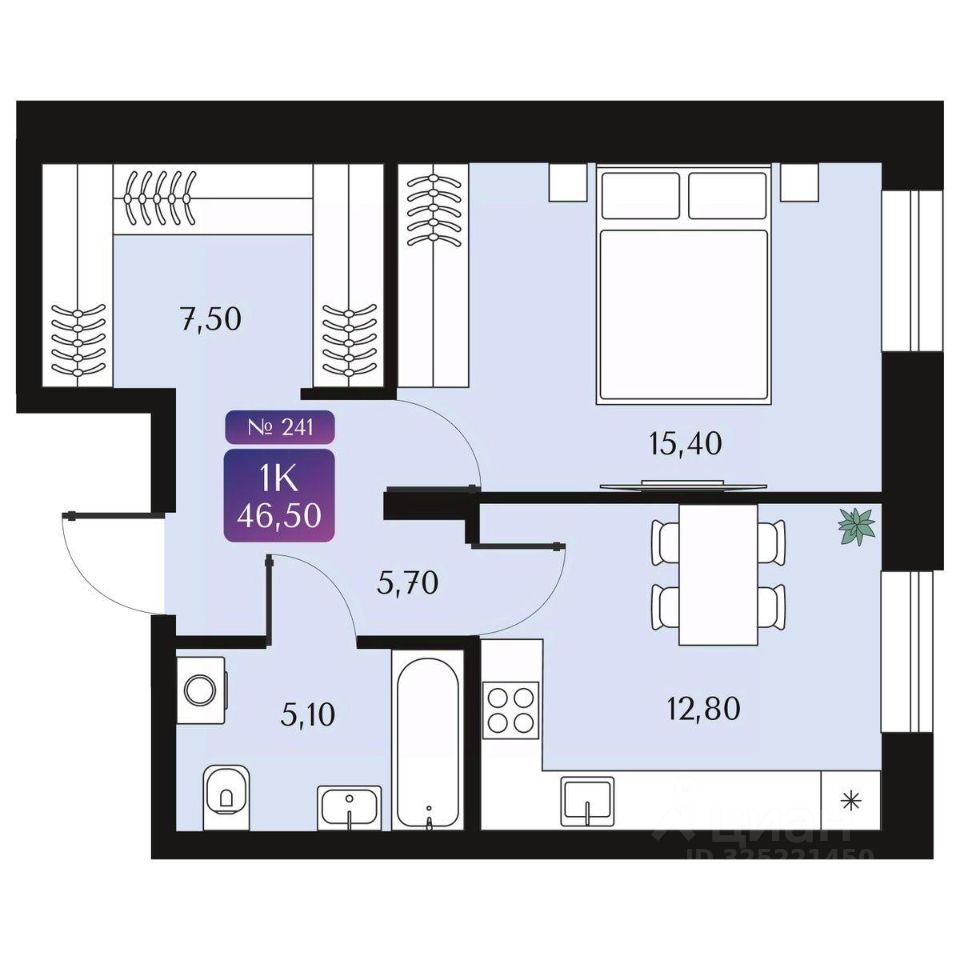 1-комнатная квартира, 46.5 м²