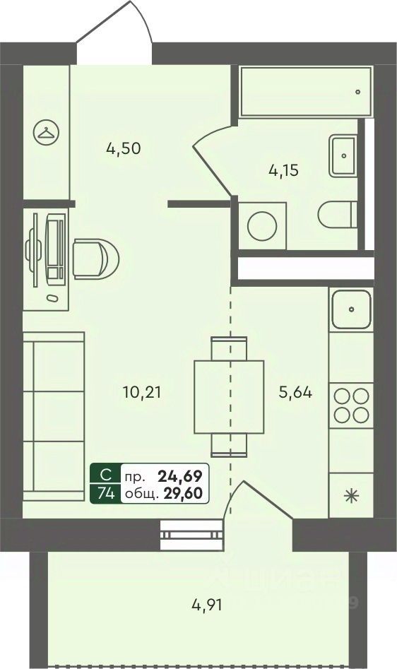 Продаётся студия в строящемся доме (ГП 2.1), срок сдачи: III-кв. 2026, общей площадью 29.6 кв.м., на 4 этаже.