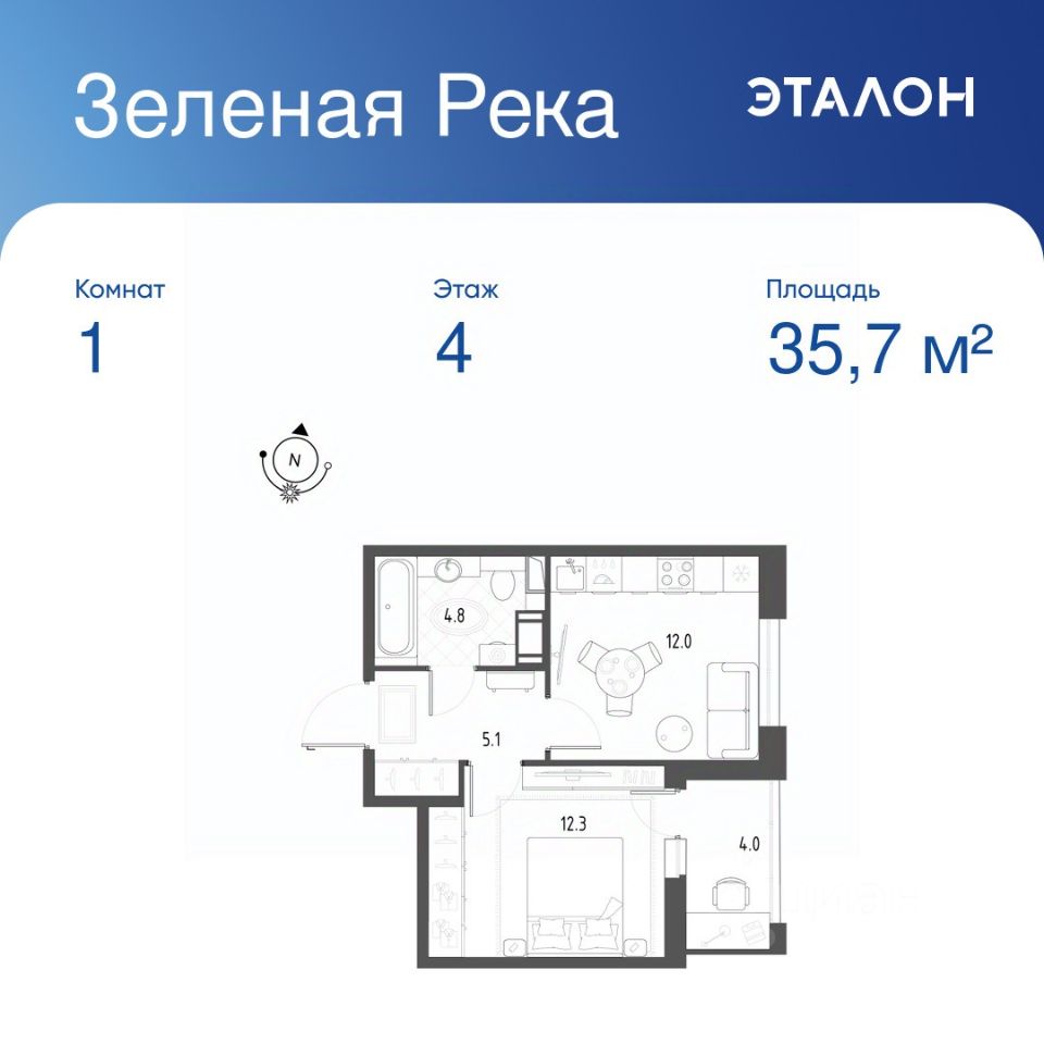 Общая площадь квартиры — 35.7 кв. м, этаж 4 из 12.
