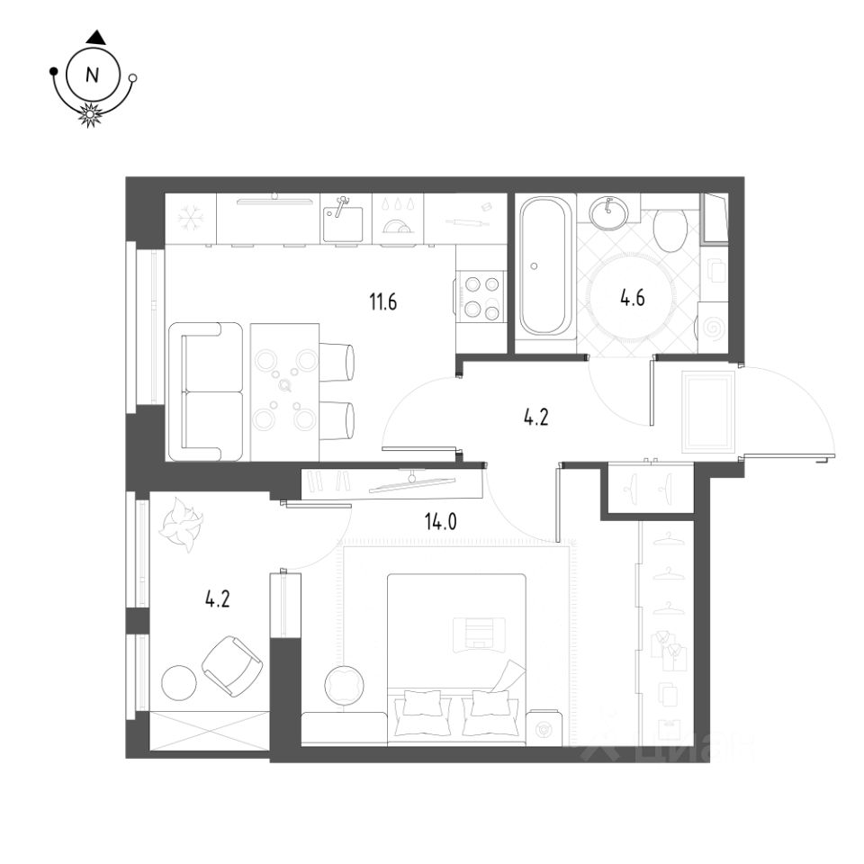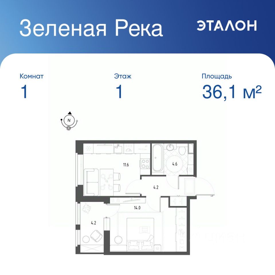 1-комнатная квартира, 36.1 м²