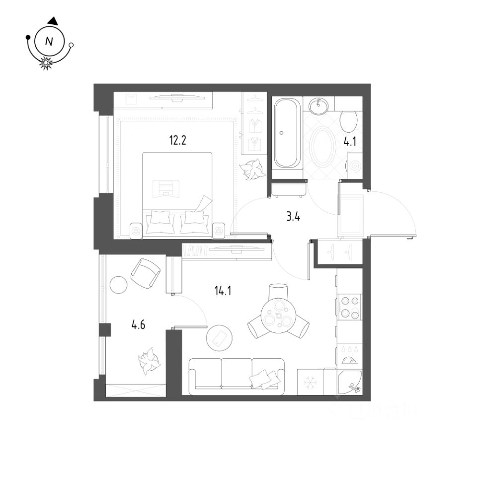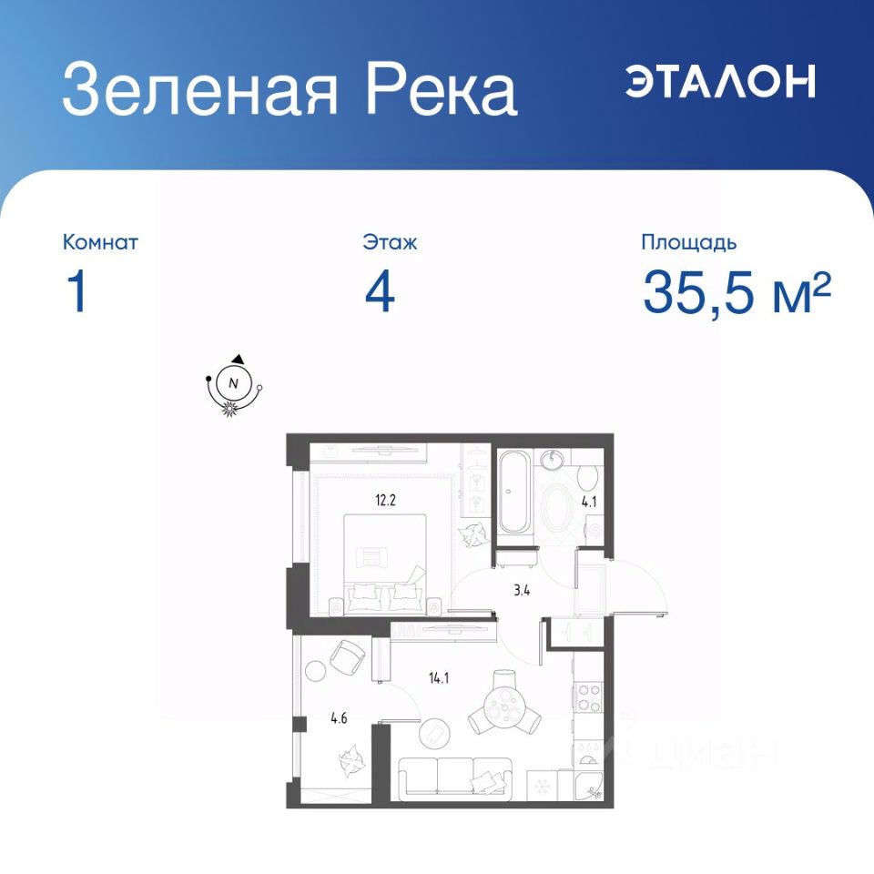 Общая площадь квартиры — 35.5 кв. м, этаж 4 из 12.