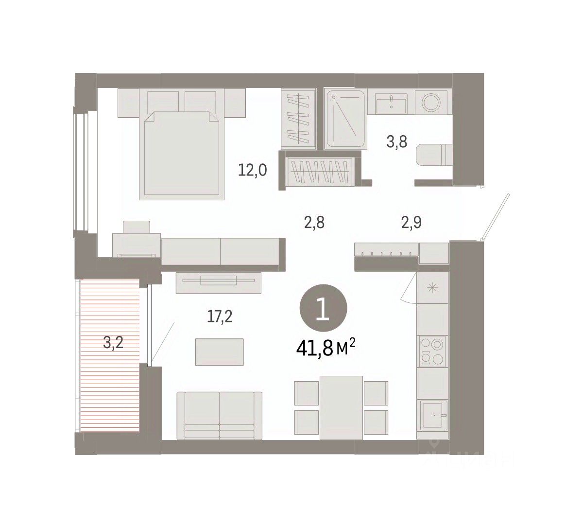 1-комн. квартира от застройщика с предчистовой отделкой в Кварталы Драверта на 11 этаже. Общая площадь: 41.84 кв.м. Высота потолков 2.82 м.