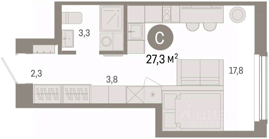 1-комн. студия от застройщика с предчистовой отделкой в Кварталы Драверта на 7 этаже. Общая площадь: 27.27 кв.м., площадь гостиной 21.6 кв.м., из которых 3.8 кв.м. выделено под кухонную зону. Все окна выходят на одну сторону. В квартире один совмещенный санузел. Высота потолков 2.82 м.