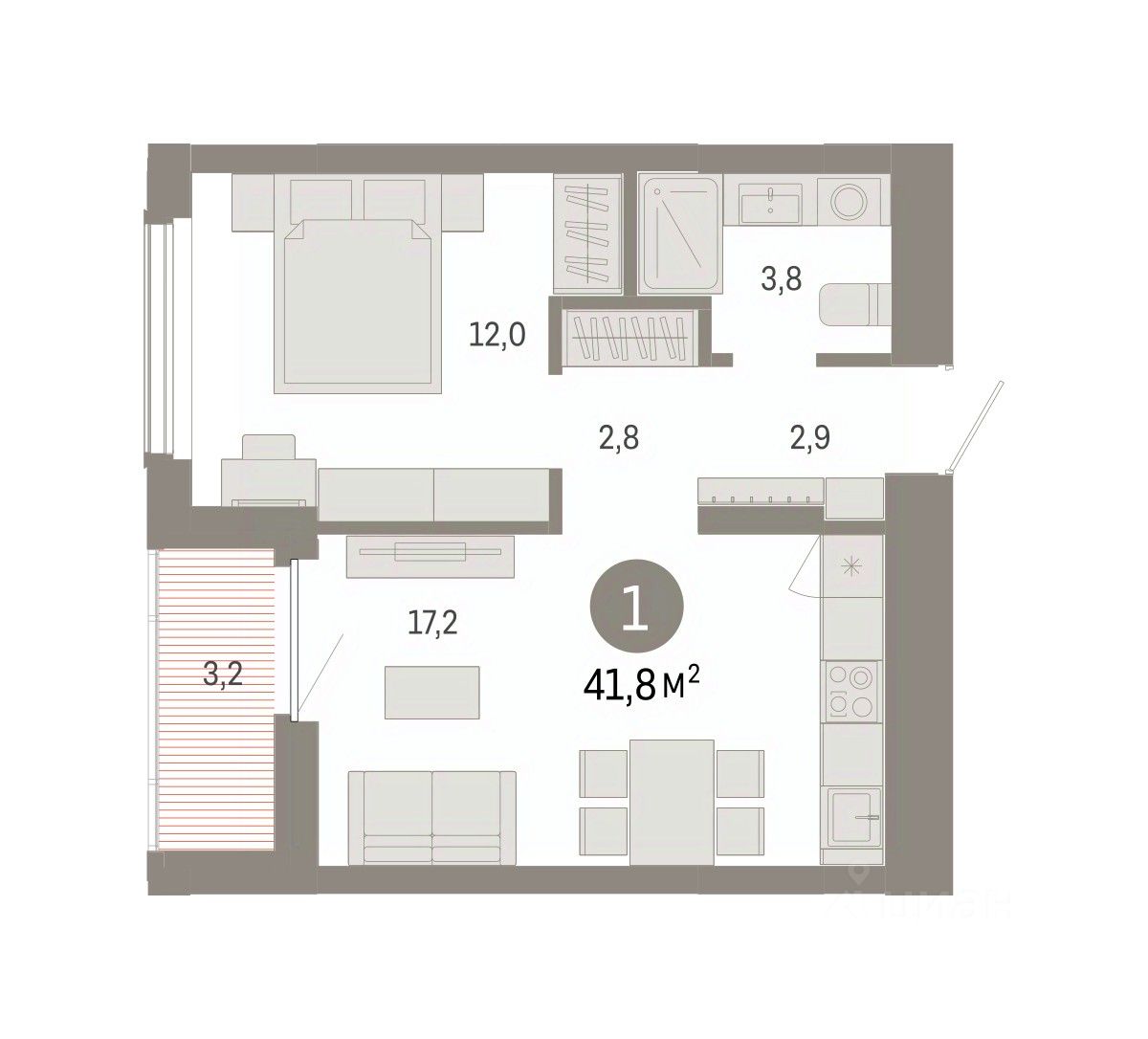 Однокомнатная квартира от застройщика с предчистовой отделкой в Кварталы Драверта на 10 этаже. Общая площадь: 41.84 кв.м. Высота потолков 2.82 м.