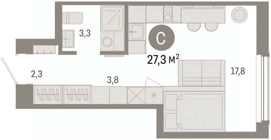 1-комн. студия с предчистовой отделкой в Кварталы Драверта на 8 этаже. Общая площадь: 27.27 кв.м., площадь гостиной 21.6 кв.м., из которых 3.8 кв.м. выделено под кухонную зону. Все окна выходят на одну сторону. В квартире один совмещенный санузел. Высота потолков 2.82 м.