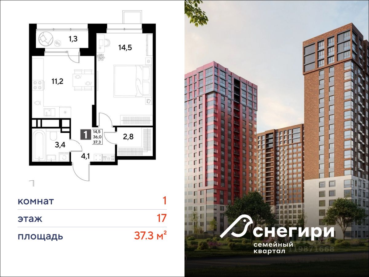 ЖК ''Снегири'', г. Омск, корпус 1 Срок сдачи: (4 кв. 2027, общей площадью 37.3 кв.м., на 17 этаже.)