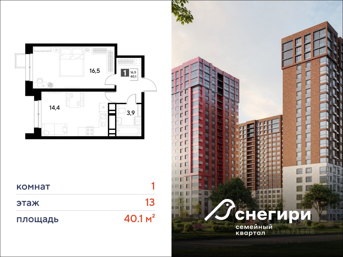 ЖК ''Снегири'', г. Омск, корпус 1 Срок сдачи: (4 кв. 2027, общей площадью 40.1 кв.м., на 13 этаже.)