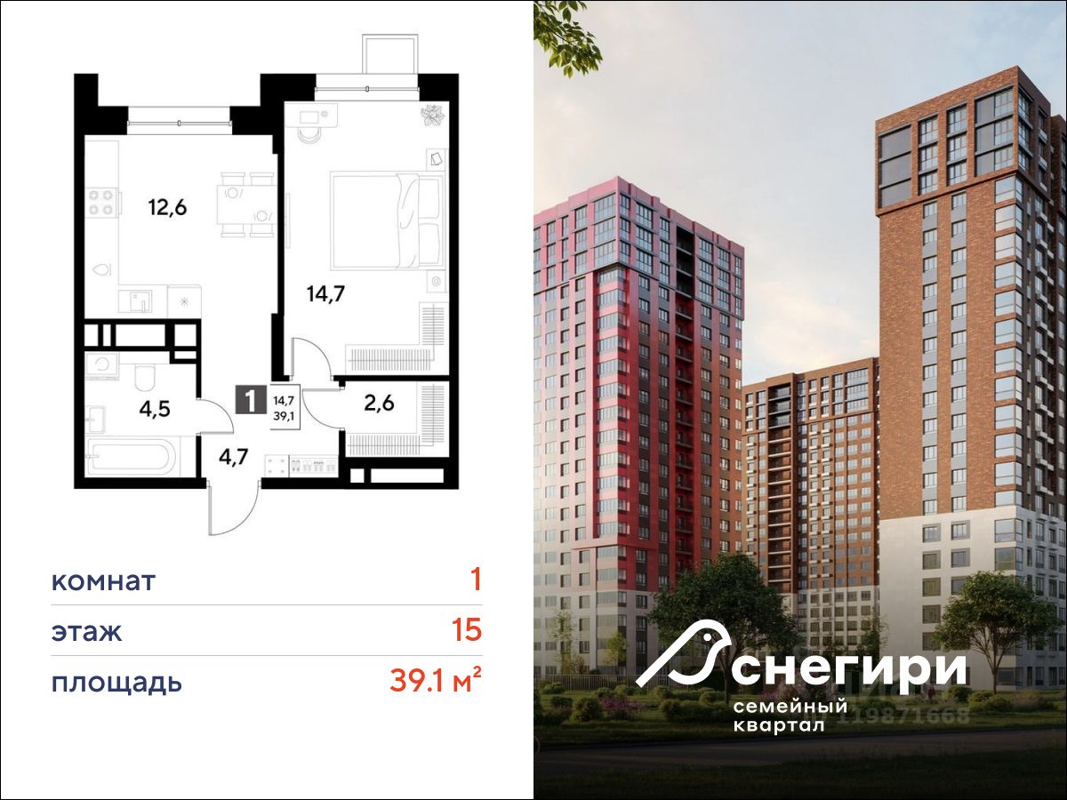 ЖК ''Снегири'', г. Омск, корпус 1 Срок сдачи: (4 кв. 2027, общей площадью 39.1 кв.м., на 15 этаже.)