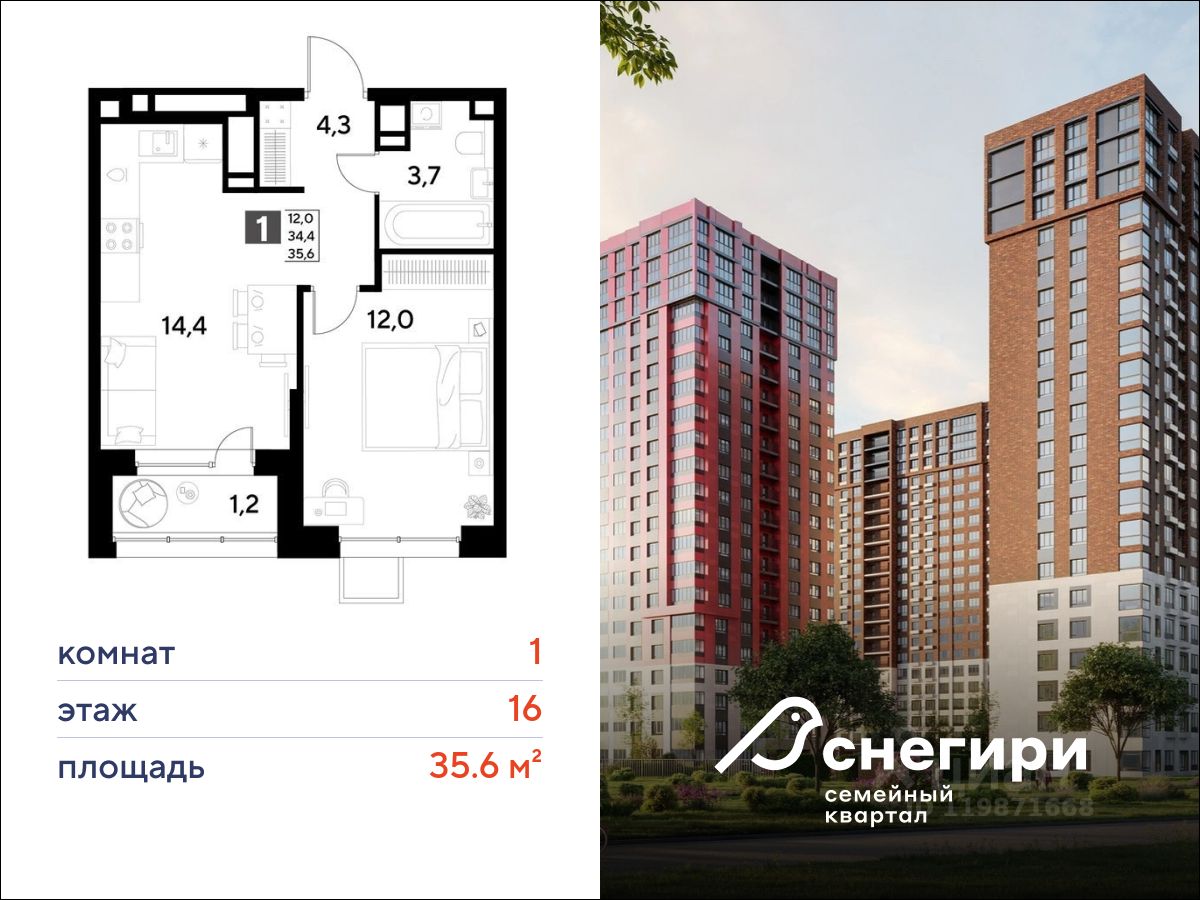 ЖК ''Снегири'', г. Омск, корпус 1 Срок сдачи: (4 кв. 2027, общей площадью 35.6 кв.м., на 16 этаже.)
