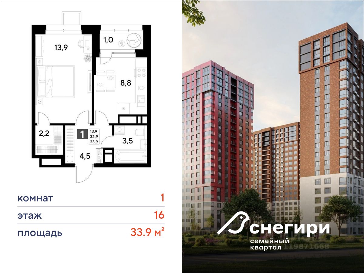 ЖК ''Снегири'', г. Омск, корпус 1 Срок сдачи: (4 кв. 2027, общей площадью 33.9 кв.м., на 16 этаже.)