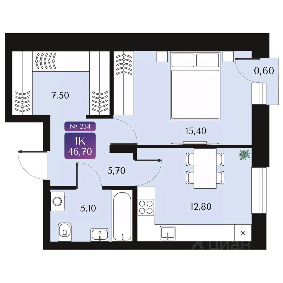 1-комнатная квартира, 46.7 м²