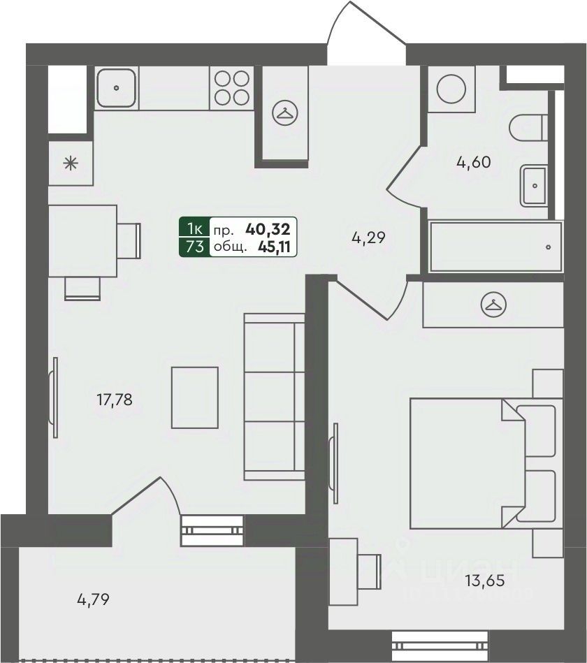 Продаётся 1-комнатная квартира в строящемся доме (ГП 2.1), срок сдачи: III-кв. 2026, общей площадью 45.11 кв.м., на 4 этаже.