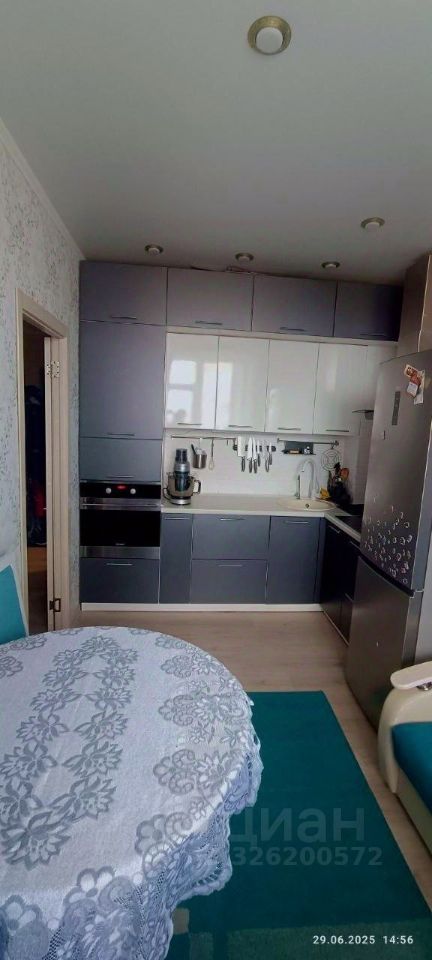 Кухня 10 м² с современным кухонным гарнитуром и техникой, которая остаётся новым хозяевам + возможно разместить диван как дополнительное спальное место. С Кухни выход на застекленный балкон (3.3 м²) с которого открывается красивый вид на город.