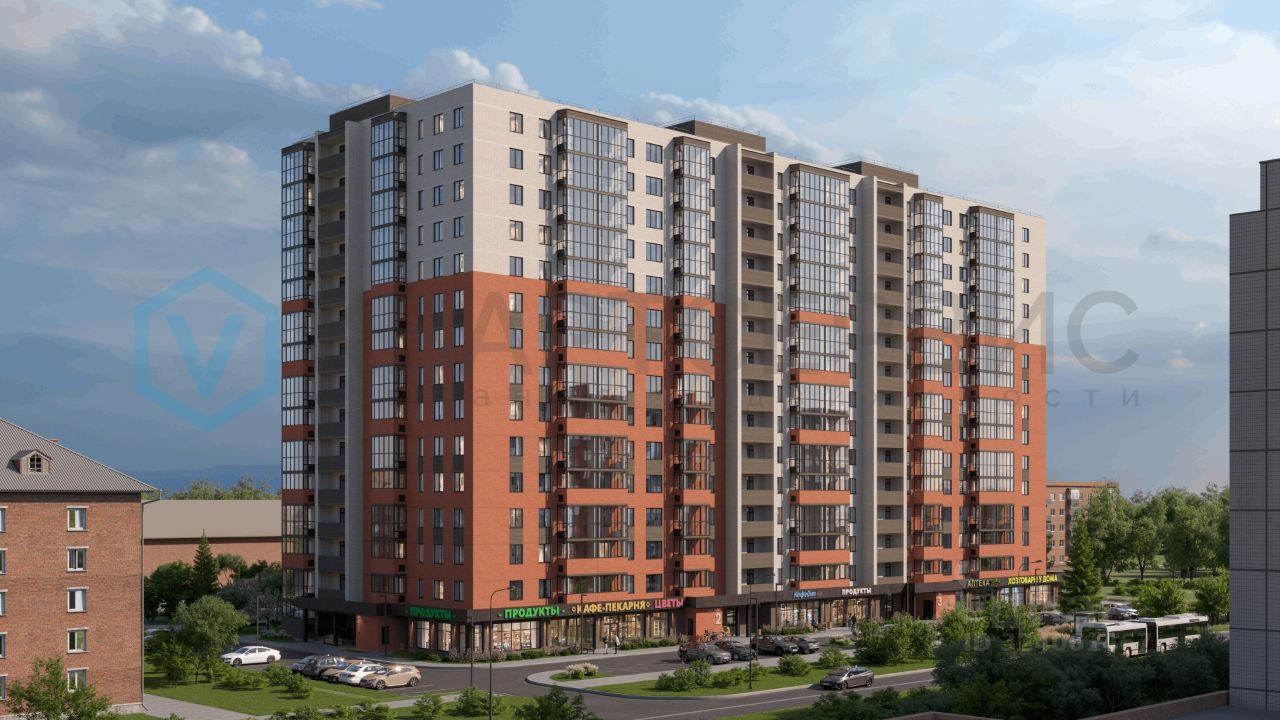 Также на первом этаже дома расположены коммерческие помещения, предусмотренные под открытие продуктового магазина, аптеки, предприятий сферы услуг и т.д.