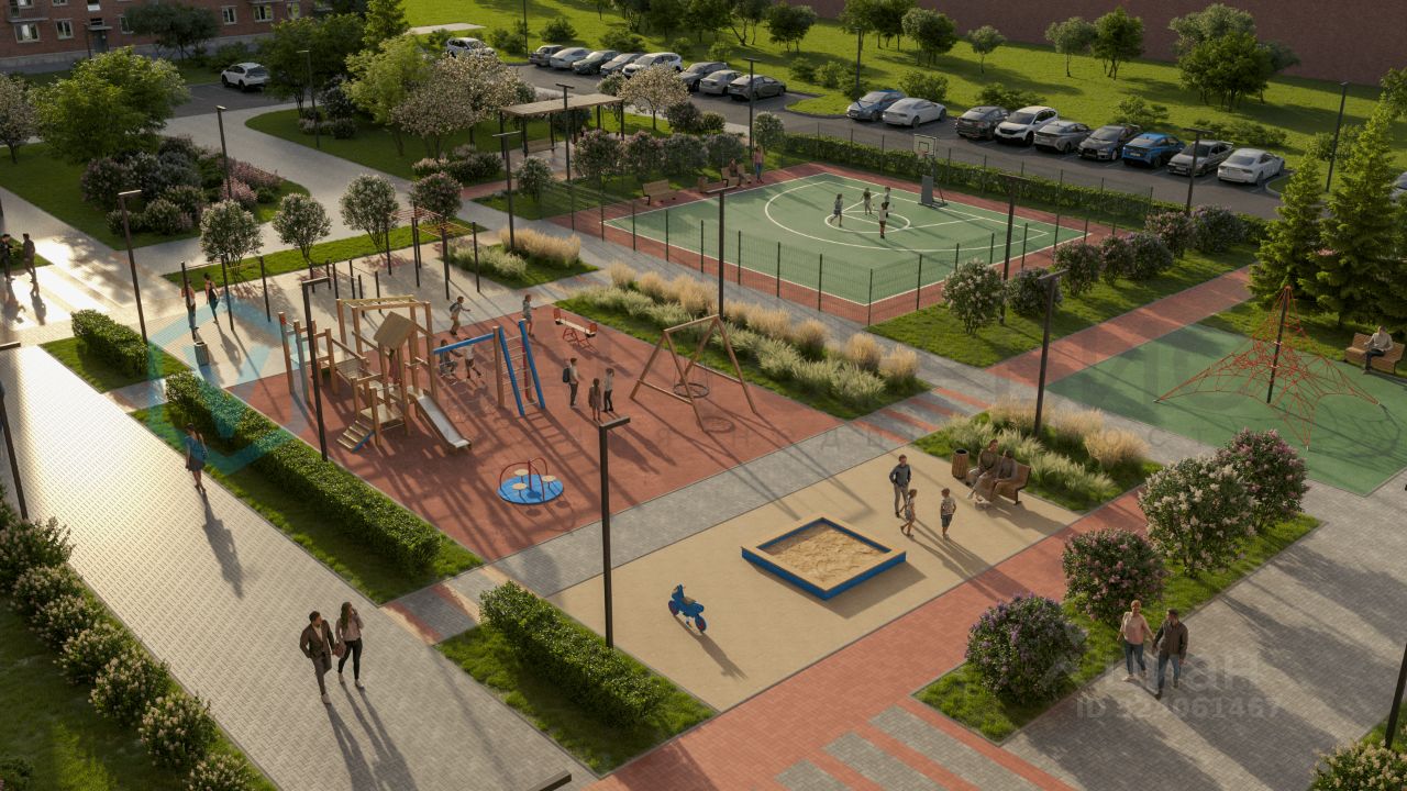 Благоустройство: внутри закрытого двора ''без машин'' будут находиться благоустроенные локации: детские и спортивные площадки, места для отдыха. Такой двор обеспечивает приватность, безопасность и комфорт для жителей, а архитектурная подсветка на фасаде здания вместе с коробами под кондиционеры придает современный внешний вид, подчеркивая геометрию здания.