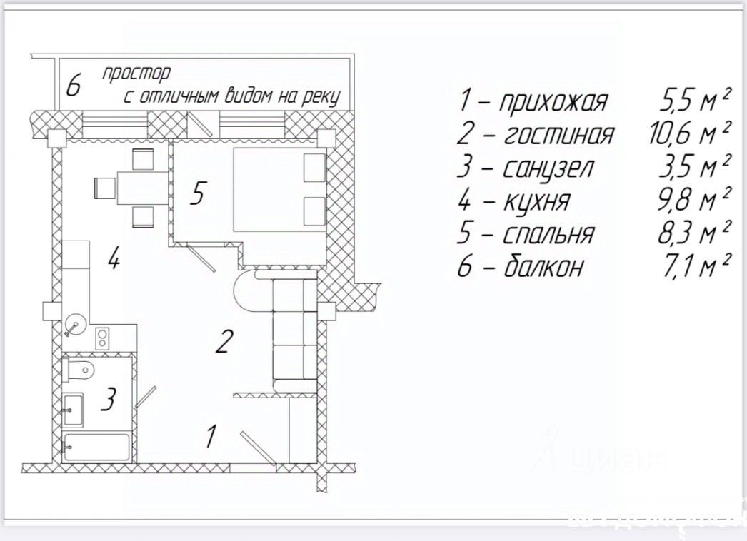 Гостиную с удобно расположенной кухней, отдельную спальню, совмещенный санузел.