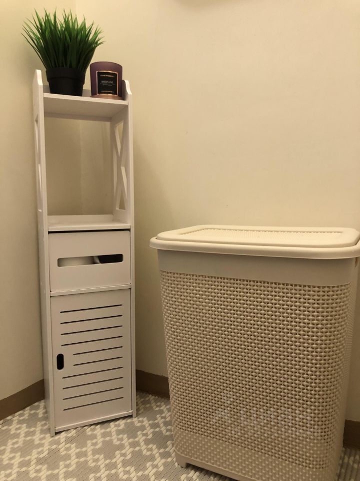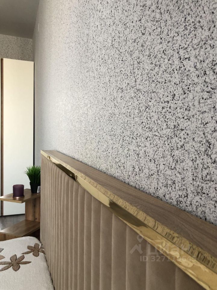 В комнате установлен вместительный шкаф с открытыми полочками сбоку, телевизор на тумбе, двуспальная кровать сделанная на заказ с матрасом Askona. Умная лампа с беспроводной зарядкой.