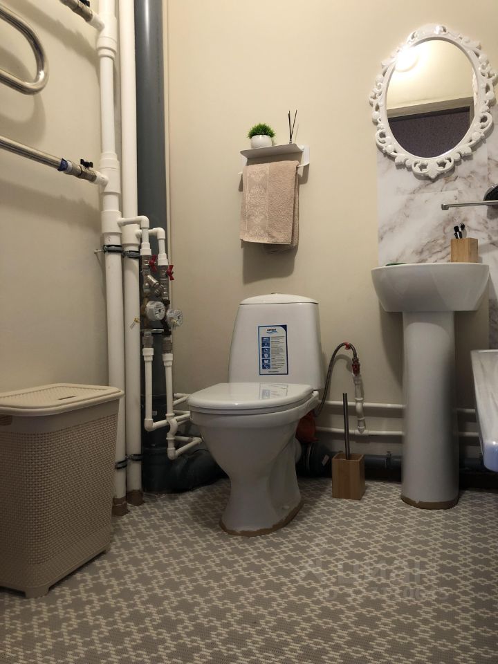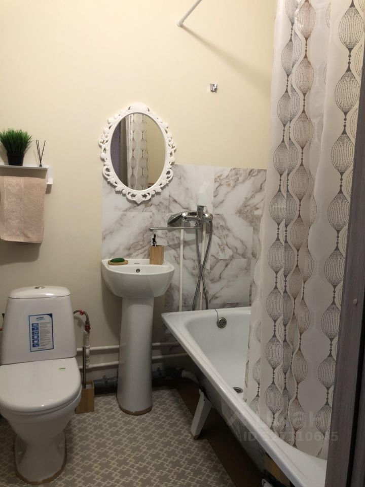 Совмещенный санузел выполнен в светлых тонах, что визуально увеличивает пространство. Лоджия с французским остеклением добавляет дополнительное место для хранения или отдыха.