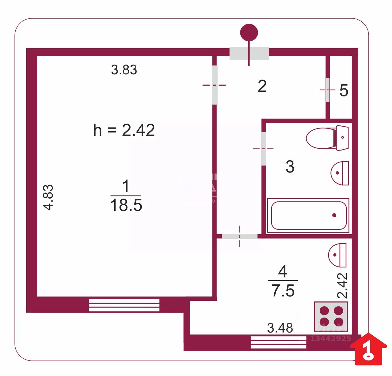 Квартира общей площадью 35 кв. метров, кухня - 7,5 кв. метров, комната - 18,5 кв. метров, имеется большой тамбур на две квартиры. Сделан косметический ремонт с заменой коммуникаций, окна ПВХ, ванная комната в кафельной плитке, имеется большой встроенный шкаф для одежды. Вариант обменный, подходит под ипотеку, один собственник, документы готовы. Звоните!