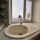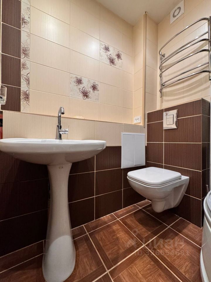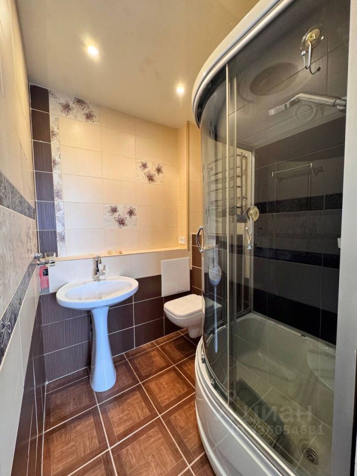 Санузел облицован плиткой. Душевой кабиной.